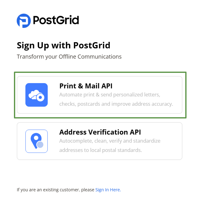 Begin by signing up for a PostGrid account and adding a payment method.