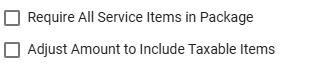The following section includes two checkboxes that control separate features: one makes all service items in the package required, and the other adjusts the credit amount to include tax for taxable items.