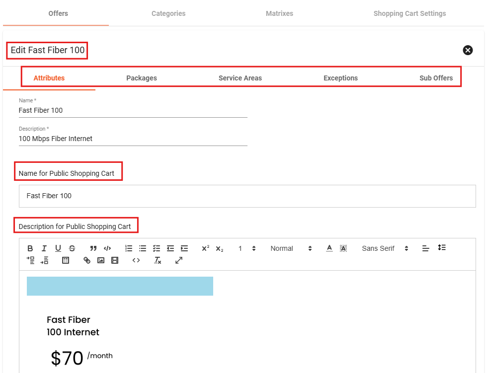 Service Offers are made up of different Service Packages with a start and end date. Offers are then assigned to one or more Service Area. Subscribers will then have the option to purchase an offer that best suits their needs in the public shopping cart.