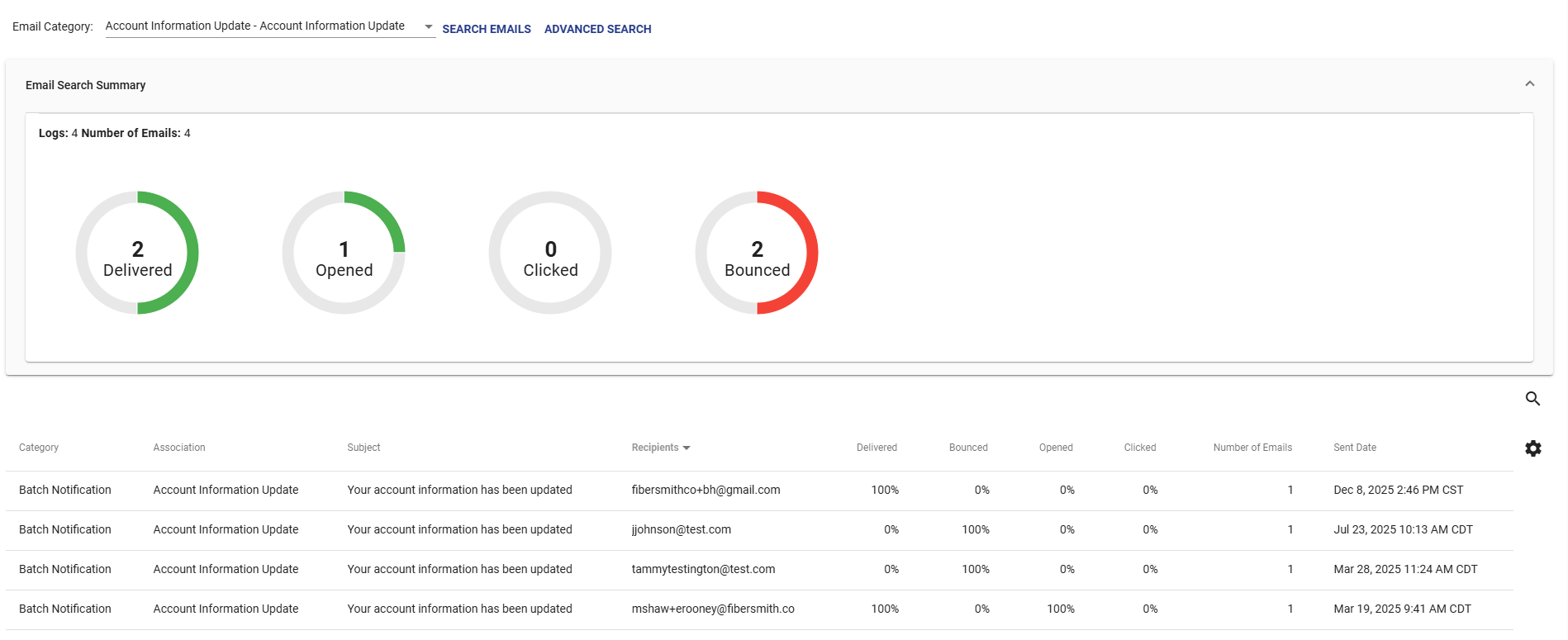 Once an email category is chosen you get a visual summary at the top for all of the emails sent and more information at the bottom specific to each batch that was sent out.