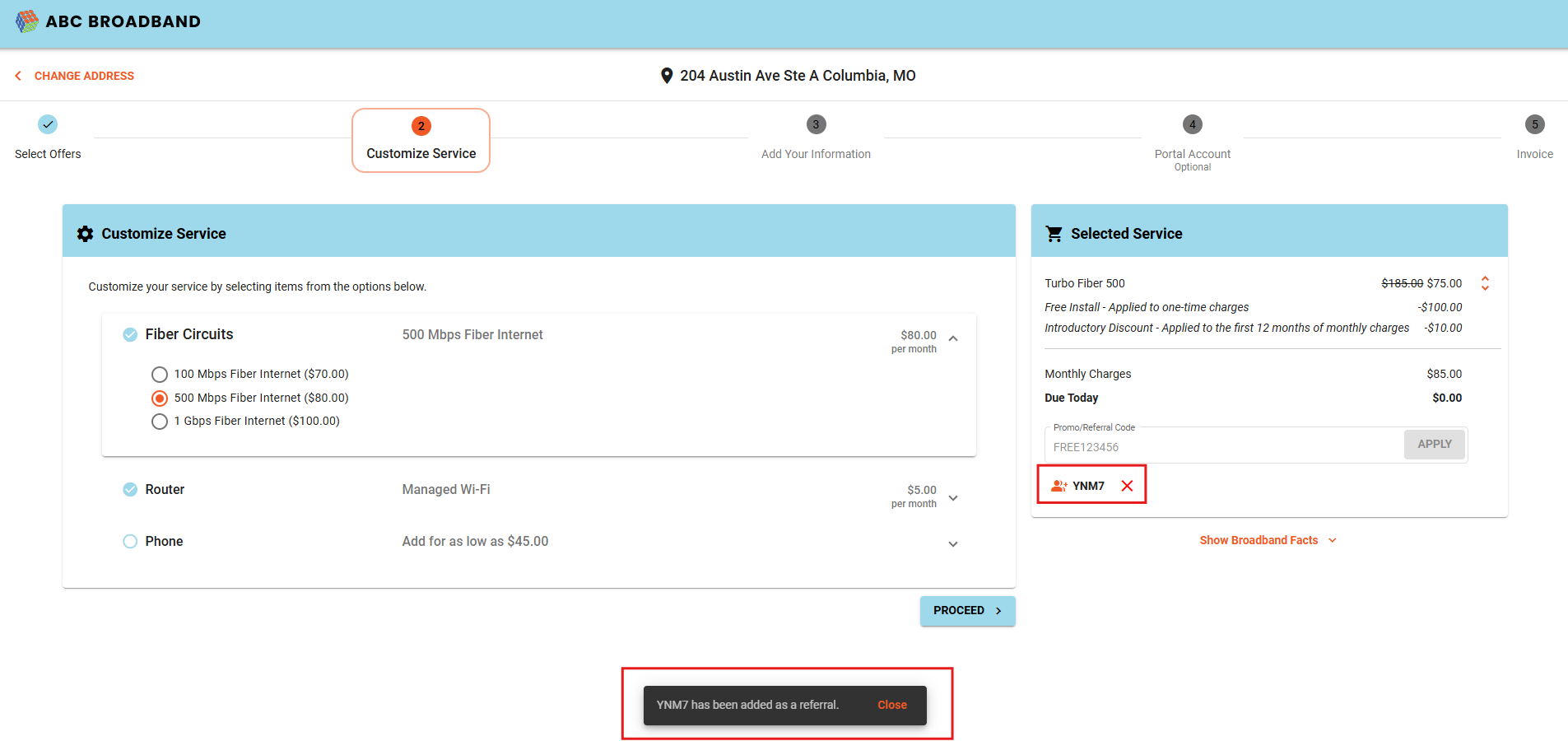 The unique link will direct the referred friend to the online shopping cart with the referral code already applied to the shopping cart when they select an offer. After selecting the offer the subscriber will continue throughout the checkout procedure by filling out their contact information, and portal account to finish the online shopping cart process.
